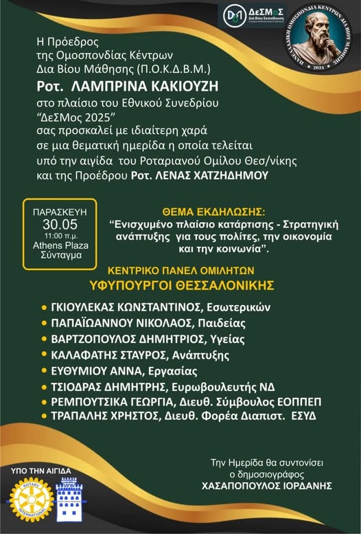 Η Πανελλαδική Ομοσπονδία Κέντρων Διά Βίου Μάθησης (Π.Ο.Κ.Δ.Β.Μ.), έχει την τιμή να σας προσκαλέσει σε μία θεματική κλειστή ημερίδα, την Παρασκευή 30 Μαΐου 2025 και ώρα 11:00 πμ στο Athens Plaza Βασ.Γεωργίου 2 Πλ.Συντάγματος, υπο την αιγίδα του Ροταριανού Ομίλου Θεσσαλονίκης και της Προέδρου Ροτ.Λένας Χατζηδήμου.
